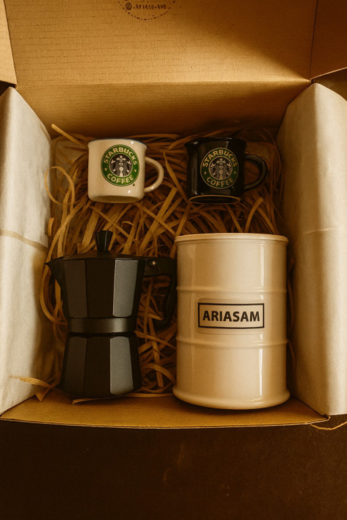 این باکس هدیه قهوه برای کسانی طراحی شده که عاشق دمآوری قهوه با سبک خاص خود هستند. شامل موکاپات ۲ کاپ تمام مشکی، بانکه آریاسام سایز متوسط و دو عدد شات استارباکس در رنگ سفید و مشکی است.